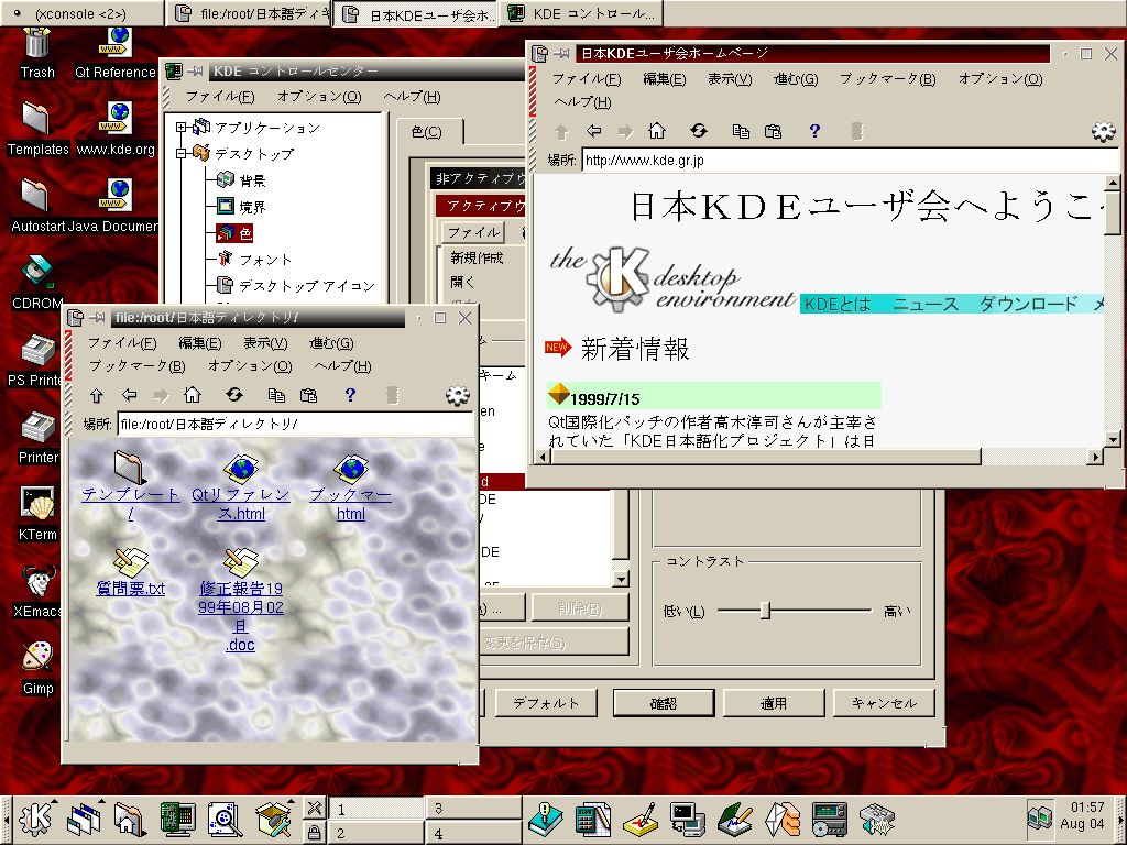 Here are some screenshots which show KDE using Japanese localisation. These screenshots are provided by the Japanese KDE Users Group (thanks to Satoshi Kinebuchi). M. Kinebuchi says: "Although Junji Takagi (developer of the Japanese support in Qt-1.X) is an excellent X and i18n engineer, we owe a lot to the fact that Troll Tech acknowledged his work, and we are also allowed to distribute this localization work. We all appreciate Troll Tech's kindly and openly decision. I think Troll Tech is a really open enterprise."